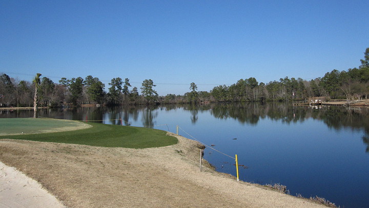 Approach shot into the par-5 18th green at Timberlake Golf Club offers views of Lake Murray.